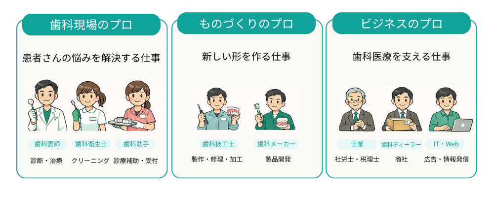 「あまり知られていないと思いますが、歯科に関わる仕事は多くあります。歯科医院には歯科医師・歯科衛生士・歯科助手がいますが、それだけではありません。入れ歯や被せ物などを作る歯科技工士、機材や歯ブラシなどを作る歯科メーカー、社労士や税理士のような専門職、歯科ディーラー、広告代理店、Web制作会社など様々な方が関わっています。